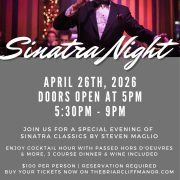 Join us for Sinatra Night at The Briarcliff Manor! April 26th, 2026 from 5 PM – 9 PM Enjoy a evening of Sinatra classics by Steven Maglio $100 per person Included in your ticket is cocktail hour with passed hors d’oeuvres & more, 3-course dinner and wine *Reservations are required. Limited two tops available. Smaller parties may be seated with other reservations BUY YOUR TICKETS HERE