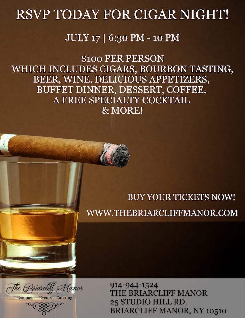 July Cigar Night Event Details Date/Time: Monday, July 17th, 2023 from 6:30pm to 10:00pm Venue: The Briarcliff Manor, 25 Studio Hill Rd, Briarcliff Manor, NY 10510 Categories: Cigar Night RSVP Today for Cigar Night on July 17 from 6:30 PM – 10 PM!$100 per person which includes cigars, bourbon tasting, beer, wine, delicious appetizers, buffet dinner, dessert, coffee, a FREE specialty cocktail & more!BUY YOUR TICKETS NOW! Buy Tickets on Eventbrite Buy Tickets Bookmark the Permalink « Previous EventNext Event »